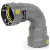 Viega MegaPressG series, gas press elbow fitting connects (2) 3/4" black gas pipes at a 90-degree angle.