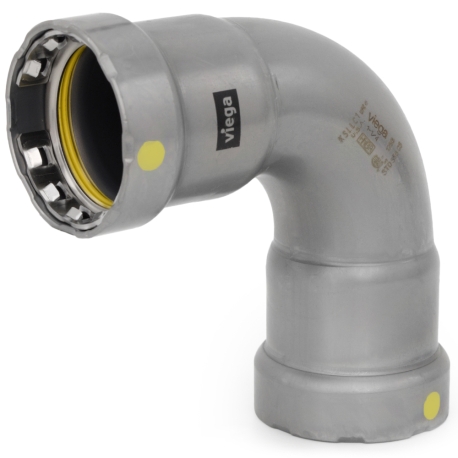 Viega MegaPressG series, gas press elbow fitting connects (2) 1-1/4" black gas pipes at a 90-degree angle.