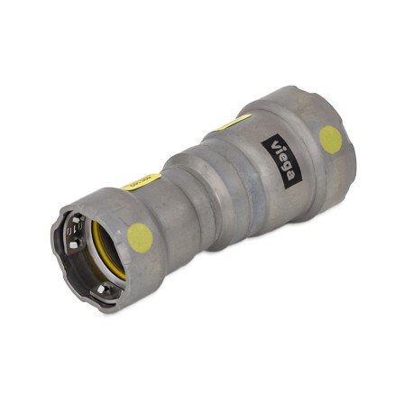 Viega MegaPressG series, gas press reducing coupling connects 3/4" and 1/2" black steel gas pipes together in a straight line.