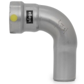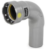 Viega MegaPressG series, gas press street elbow fitting connects 3/4" black gas pipe inside another 3/4" gas press fitting at a 90-degree angle.
