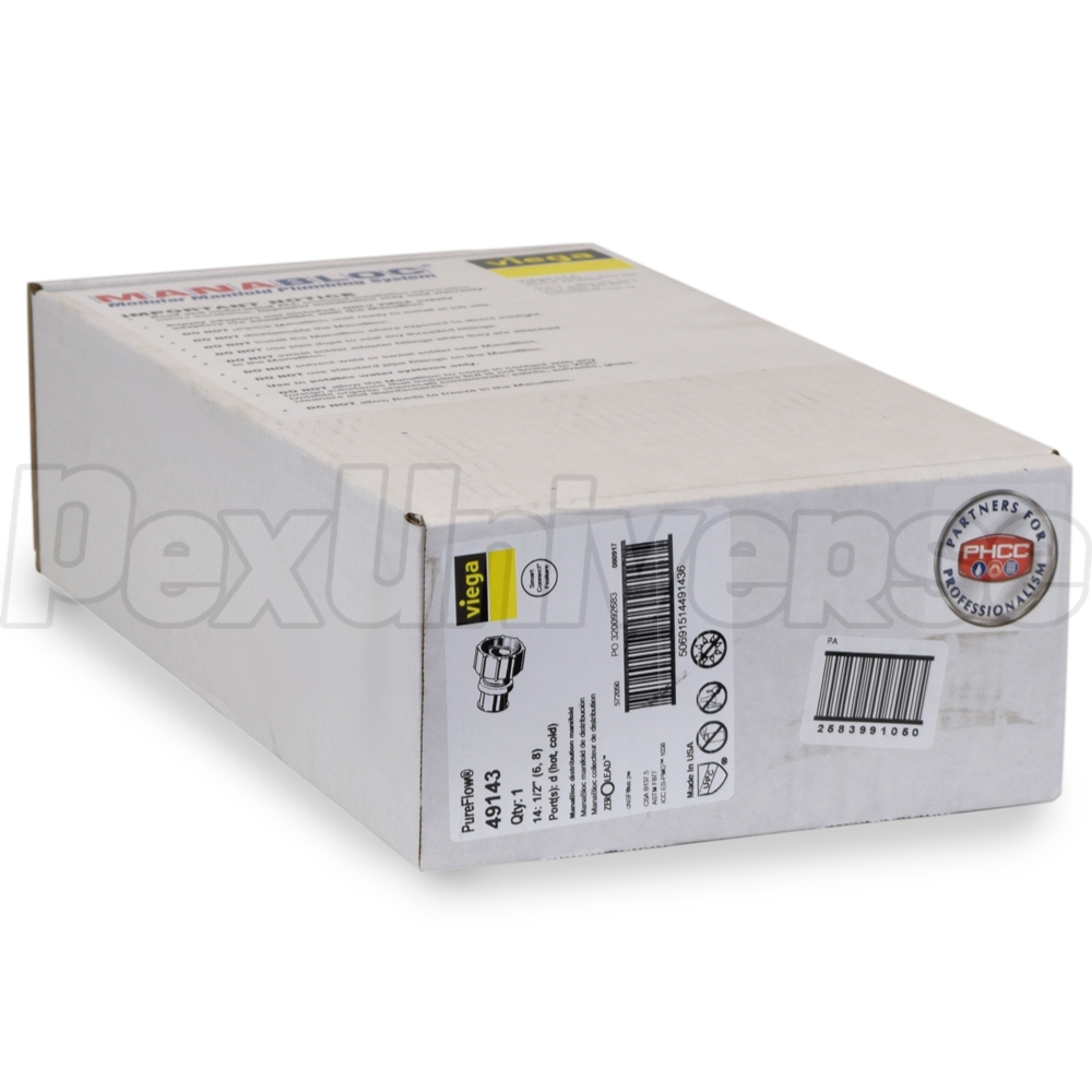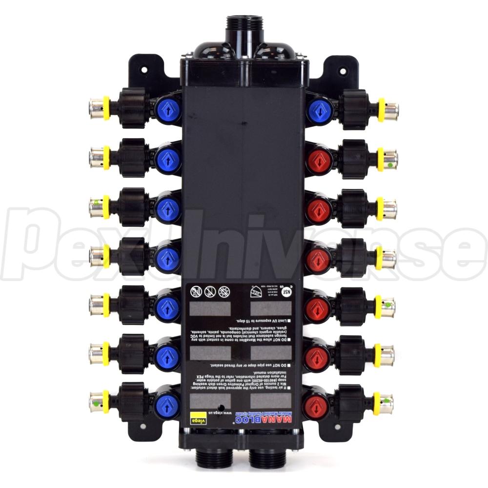 Viega ManaBloc manifold with (14) 1/2" PEX Press ports - (6) Hot and (8) Cold. Intended for use with ViegaPEX Ultra (Potable/Non-barrier) and Viega FostaPEX tubing and connection methods. Also compatible with all other types (A, B, C) and brands of PEX tubing. Each port (branch) is equipped with a built-in 1/4 turn shut-off valve for individual fixture control. Includes PEX adapters for all ports (branches) and Valve Key.