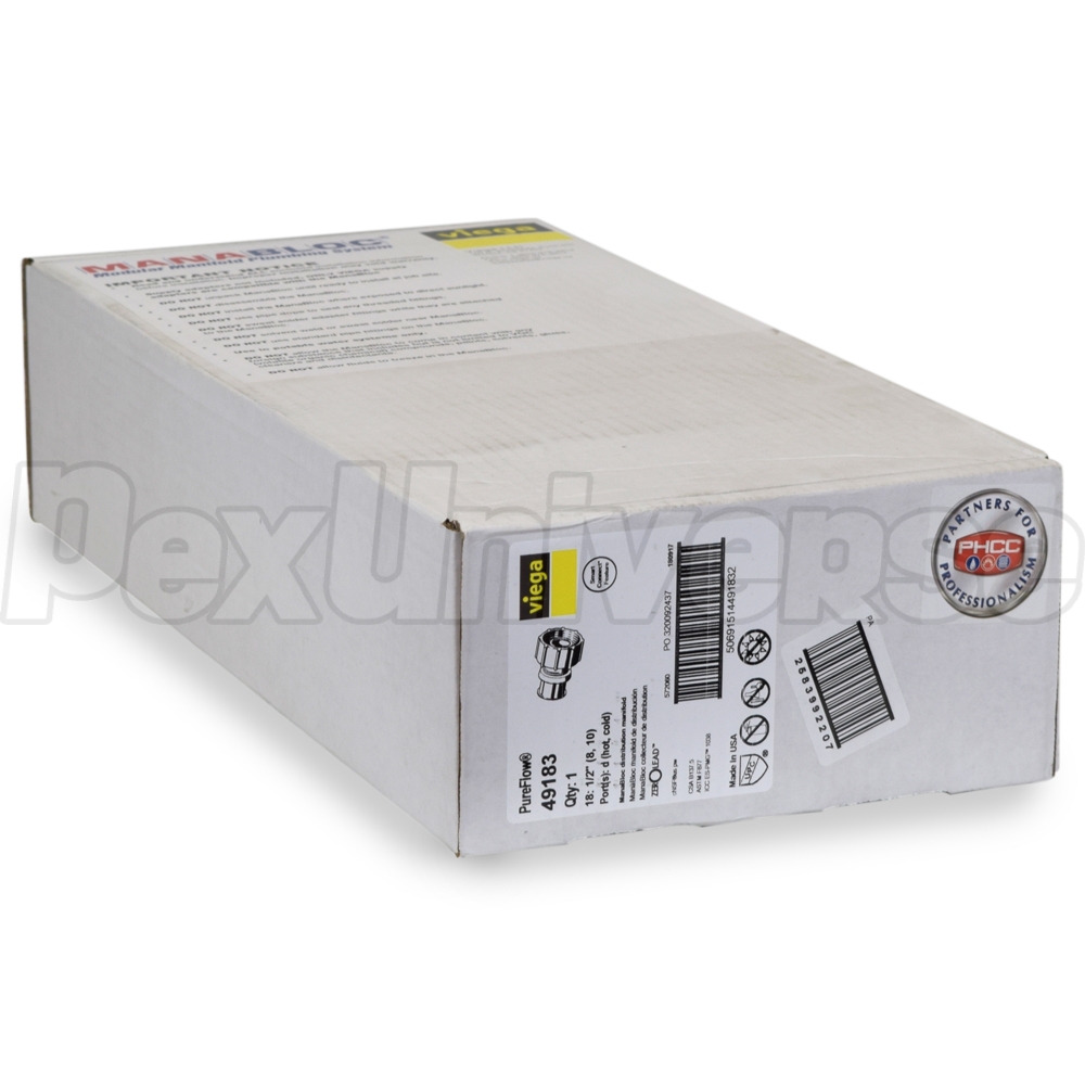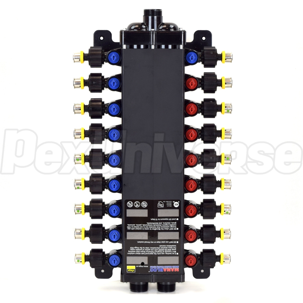 Viega ManaBloc manifold with (18) 1/2" PEX Press ports - (8) Hot and (10) Cold. Intended for use with ViegaPEX Ultra (Potable/Non-barrier) and Viega FostaPEX tubing and connection methods. Also compatible with all other types (A, B, C) and brands of PEX tubing. Each port (branch) is equipped with a built-in 1/4 turn shut-off valve for individual fixture control. Includes PEX adapters for all ports (branches) and Valve Key.