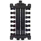 Viega ManaBloc manifold with (14) PEX ports - (6) Hot and (8) Cold. Intended for use with ViegaPEX Ultra (Potable/Non-barrier) and Viega FostaPEX tubing and connection methods. Also compatible with all other types (A, B, C) and brands of PEX tubing. Each port (branch) is equipped with a built-in 1/4 turn shut-off valve for individual fixture control.