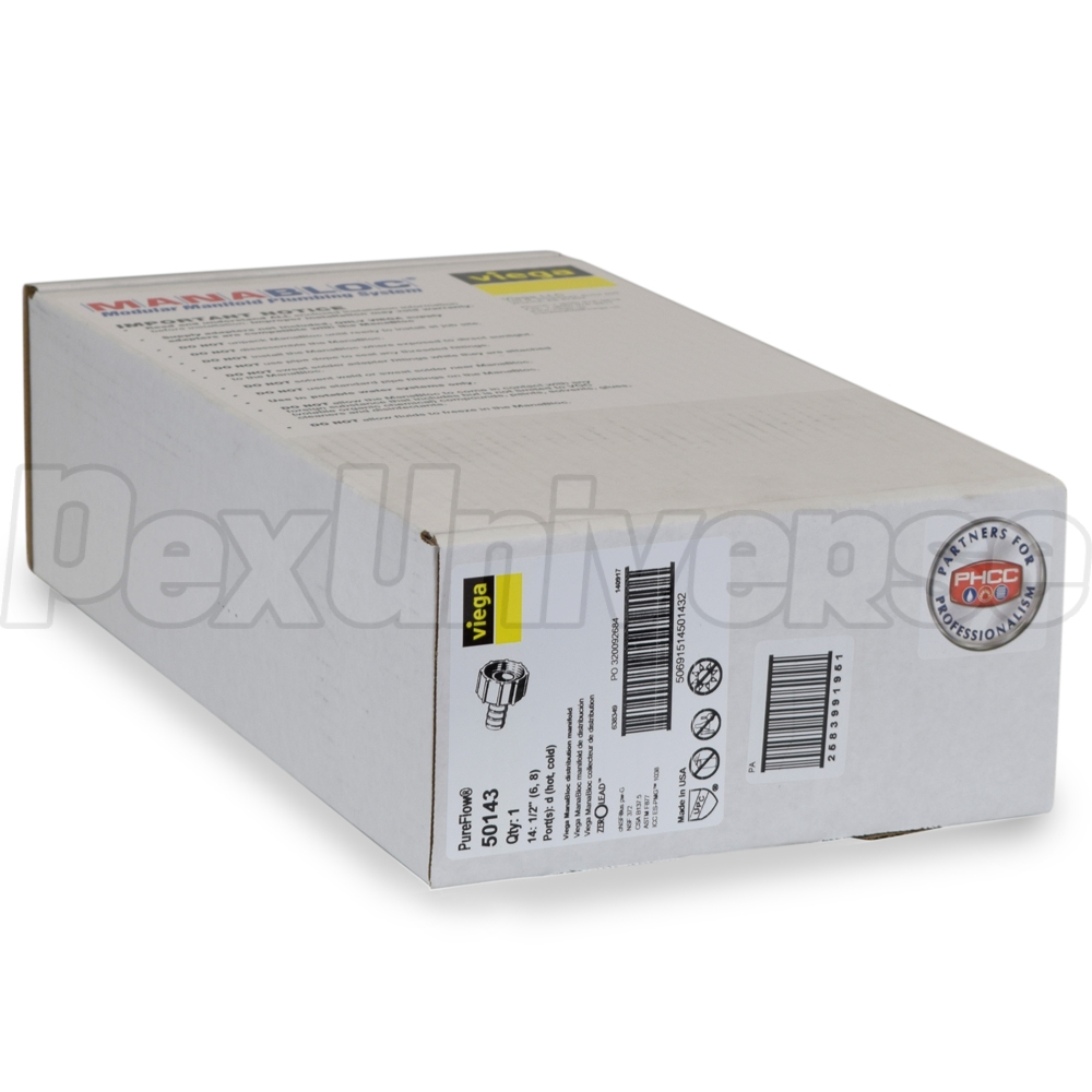 Viega ManaBloc manifold with (14) 1/2" PEX Crimp ports - (6) Hot and (8) Cold. Intended for use with ViegaPEX Ultra (Potable/Non-barrier) tubing and crimp connection method. Also compatible with all other types (A, B, C) and brands of PEX tubing. Each port (branch) is equipped with a built-in 1/4 turn shut-off valve for individual fixture control. Includes PEX adapters for all ports (branches) and Valve Key.