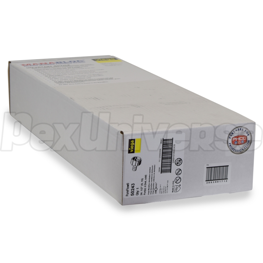 Viega ManaBloc manifold with (24) 1/2" PEX Crimp ports - (9) Hot and (15) Cold. Intended for use with ViegaPEX Ultra (Potable/Non-barrier) tubing and crimp connection method. Also compatible with all other types (A, B, C) and brands of PEX tubing. Each port (branch) is equipped with a built-in 1/4 turn shut-off valve for individual fixture control. Includes PEX adapters for all ports (branches) and Valve Key.