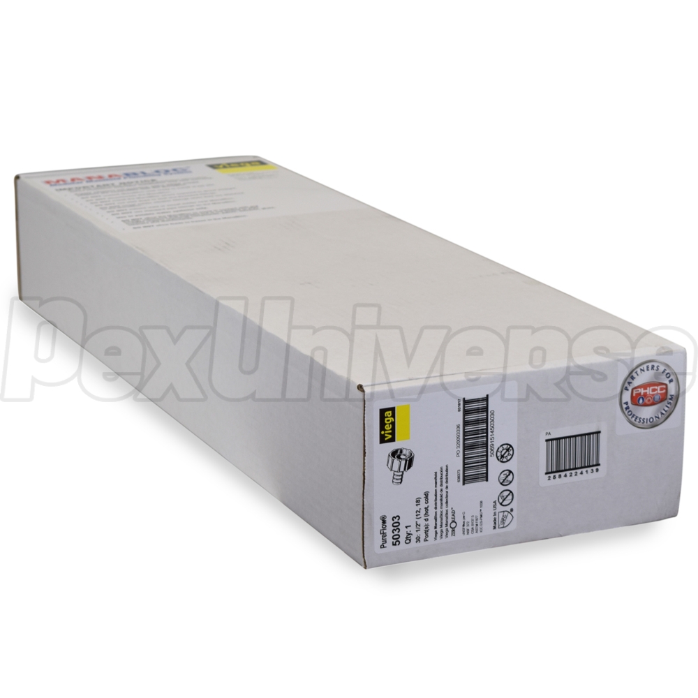 Viega ManaBloc manifold with (30) 1/2" PEX Crimp ports - (12) Hot and (18) Cold. Intended for use with ViegaPEX Ultra (Potable/Non-barrier) tubing and crimp connection method. Also compatible with all other types (A, B, C) and brands of PEX tubing. Each port (branch) is equipped with a built-in 1/4 turn shut-off valve for individual fixture control. Includes PEX adapters for all ports (branches) and Valve Key.