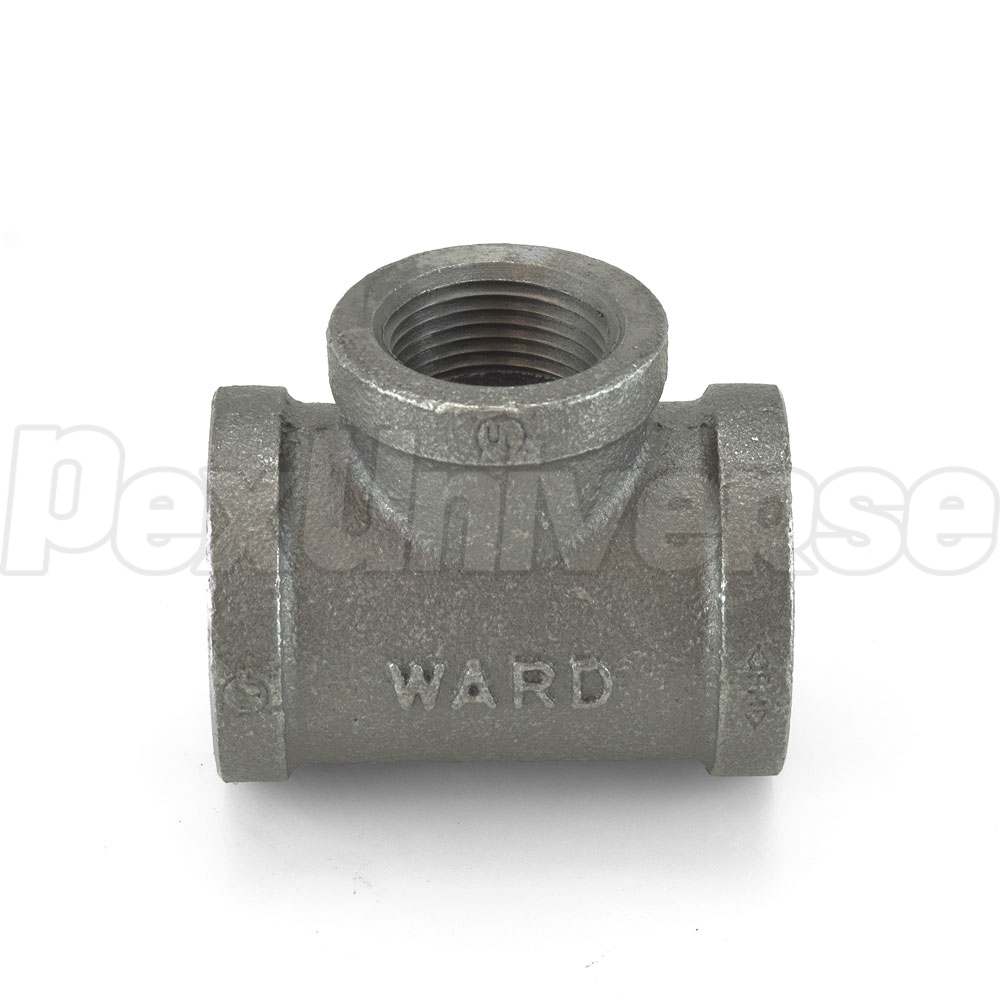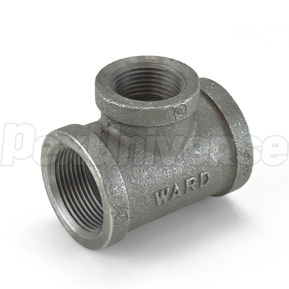This black malleable iron tee connects 1-1/4" (side), 1-1/4" (side) and 1" (middle/top) black pipes together.