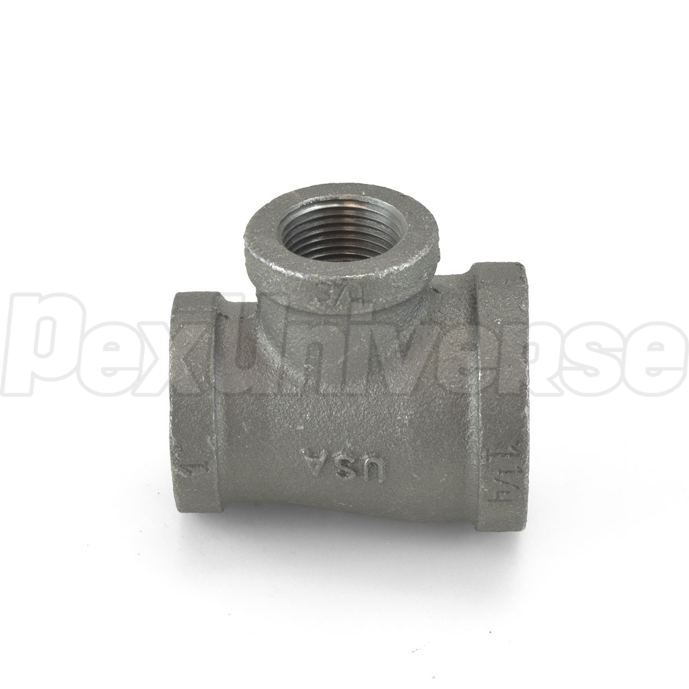This black malleable iron tee connects 1-1/4" (side), 1" (side) and 3/4" (middle/top) black pipes together.