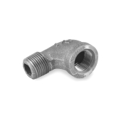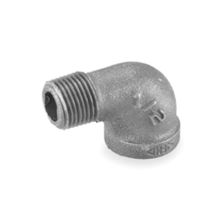 This black malleable iron street elbow connects 1/2" black pipe to 1/2" threaded black pipe fitting at a 90-degree angle.