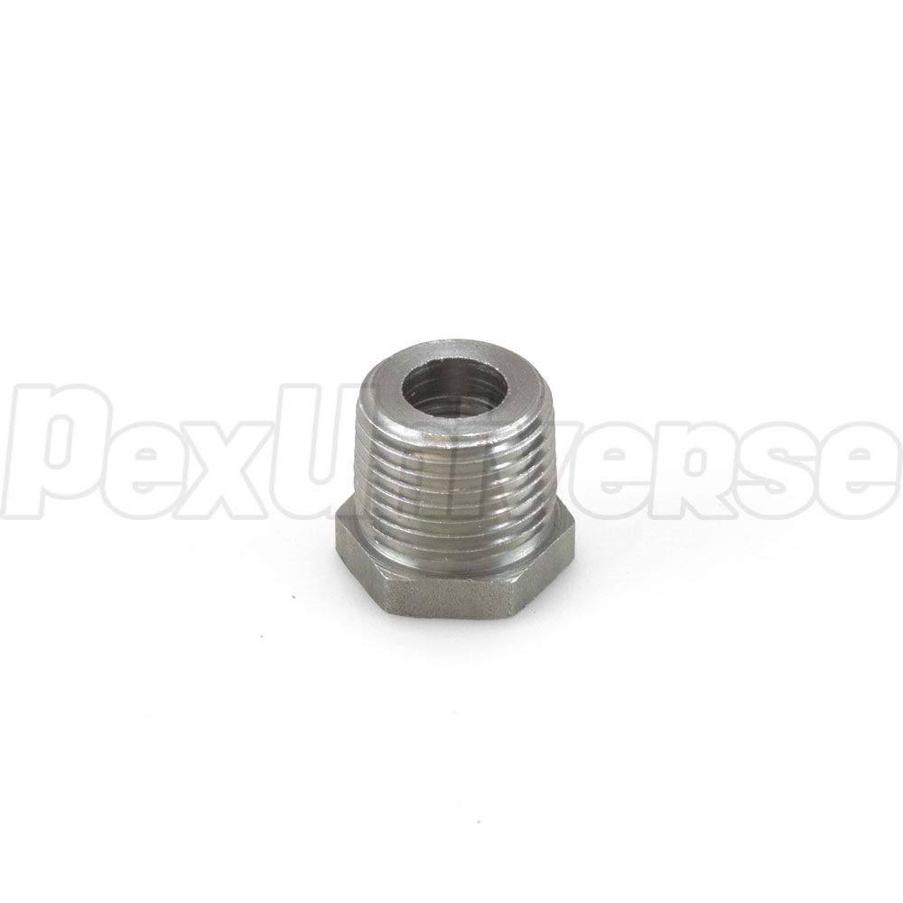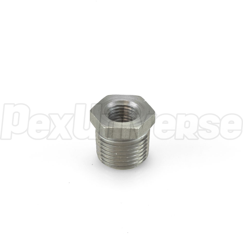 This black steel hexagon bushing connects 1/4" black pipe or nipple to 1/2" threaded black pipe fitting.
