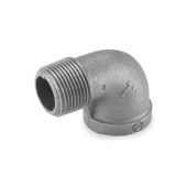 This black malleable iron street elbow connects 1" black pipe to 1" threaded black pipe fitting at a 90-degree angle.