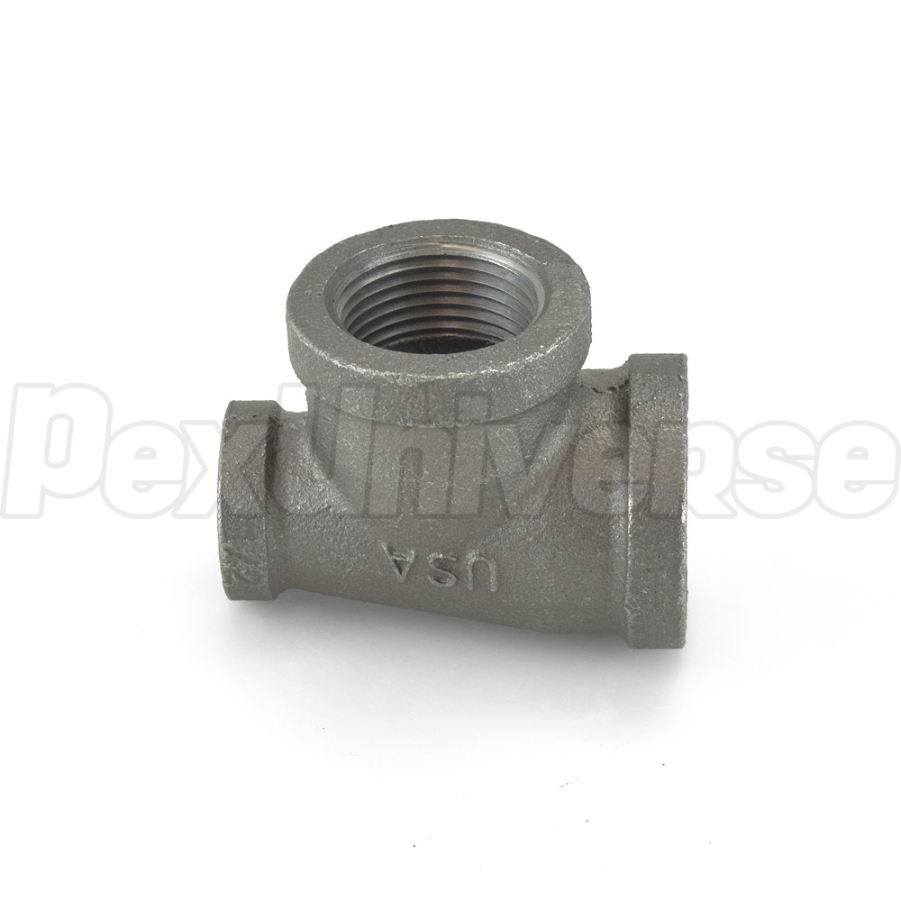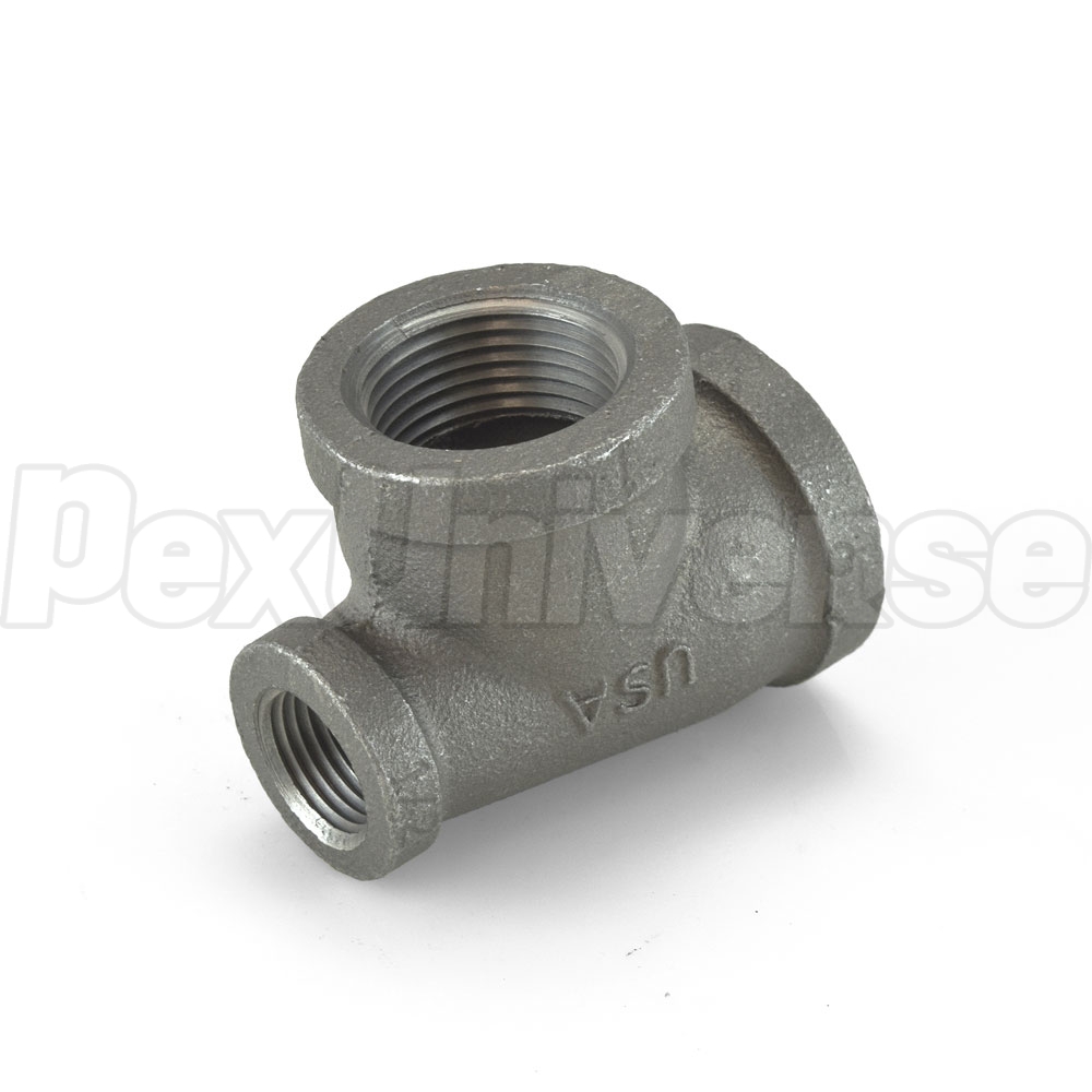 This black malleable iron tee connects 1" (side), 1/2" (side) and 1" (middle/top) black pipes together.