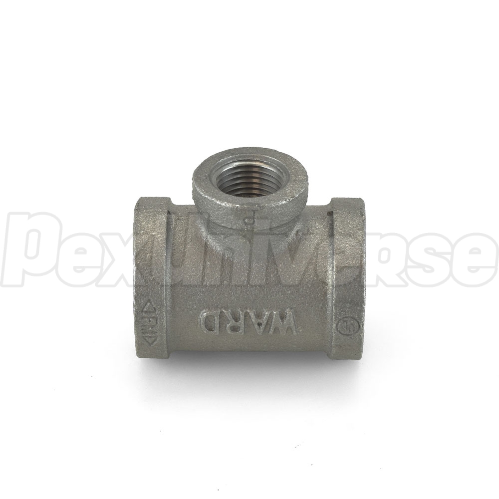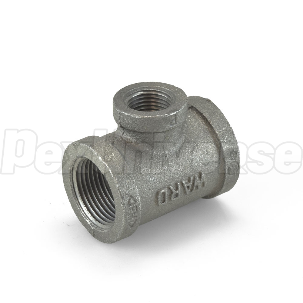 This black malleable iron tee connects 1" (side), 1" (side) and 1/2" (middle/top) black pipes together.