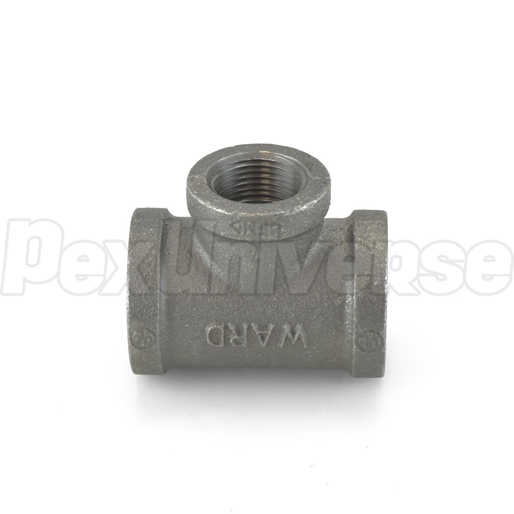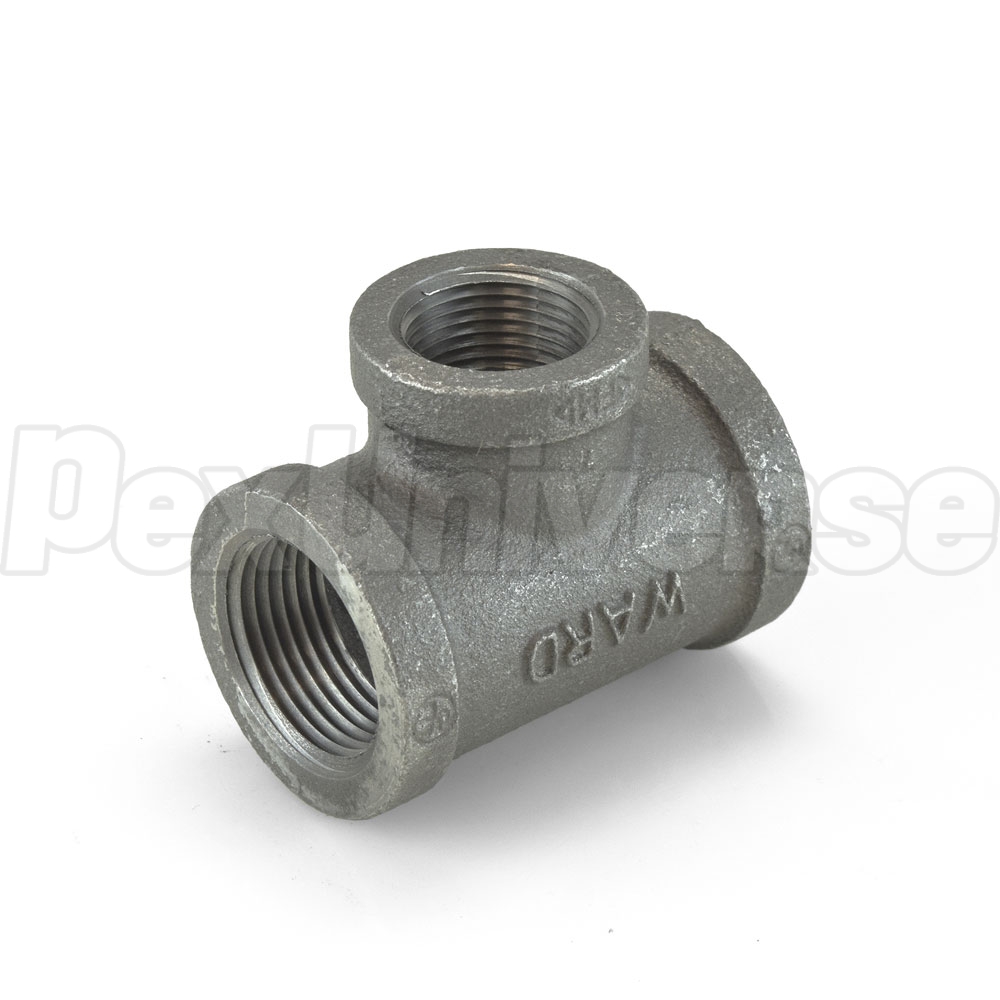This black malleable iron tee connects 1" (side), 1" (side) and 3/4" (middle/top) black pipes together.