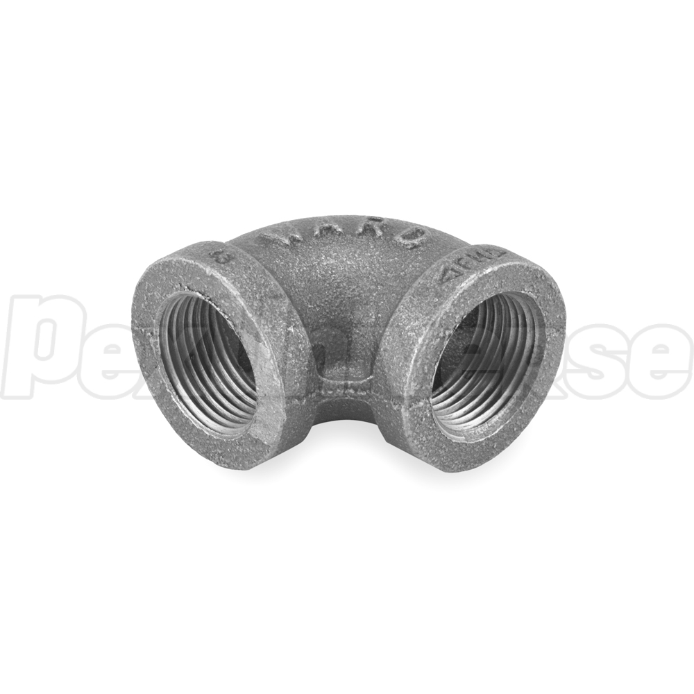 3/4" black malleable iron elbow connects two male threaded black pipes at a 90-degree angle.