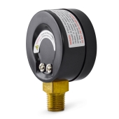 • Materials of construction: Painted black steel case, Acrylic lens, White aluminum (with black and red markings) dial, Brass socket/movement, Phosphor bronze bourdon tube, Aluminum black pointer