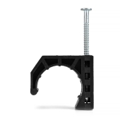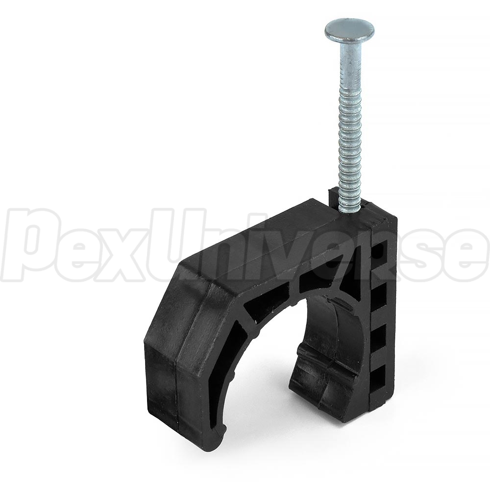 Tube Talons (J-Clamps) with Nail. Compatible with 1" PEX tubing, 1" copper pipes and 1" CPVC pipes. Can be used to secure tubing / piping to wooden surfaces,such as joists, studs, beams, subfloor, etc. Designed to offset the tubing from the mounting surface and eliminate or reduce noise problems associated with thermal changes in the plumbing/heating system. Protruding nail length (wooden surface penetration depth) is 1-1/8".