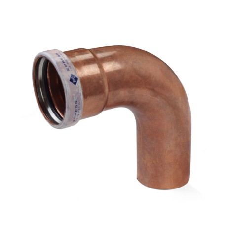 This long turn press elbow fitting connects 3" copper pipe to 3" press fitting outlet at a 90-degree angle.