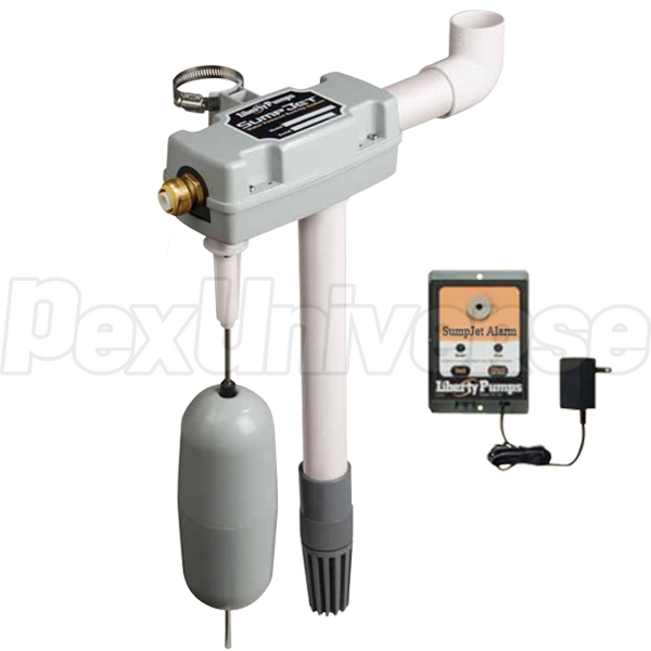 The Liberty Pumps SumpJet SJ10A is a water-powered, sump-pump back-up system with a 1-1/2" discharge and a pre-mounted alarm system to warn when the SumpJet is activated. The Liberty Pump SJ10A is not intended to be used as the main sump water removal pump. The Liberty SJ10A requires no electricity to be operated and serves as a emergency back-up to an existing pump system during power outages. This back-up system is fully automatic and uses the municipal water supply to evacuate water from the sump. It accepts 20PSI to 100PSI inlet supply pressure.