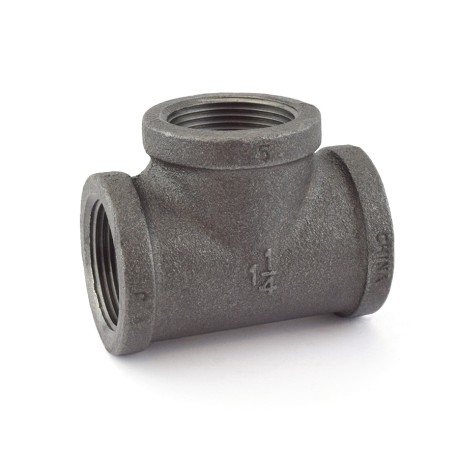 This black malleable iron tee connects three 1-1/4" pipes together. Approved for potable water use.