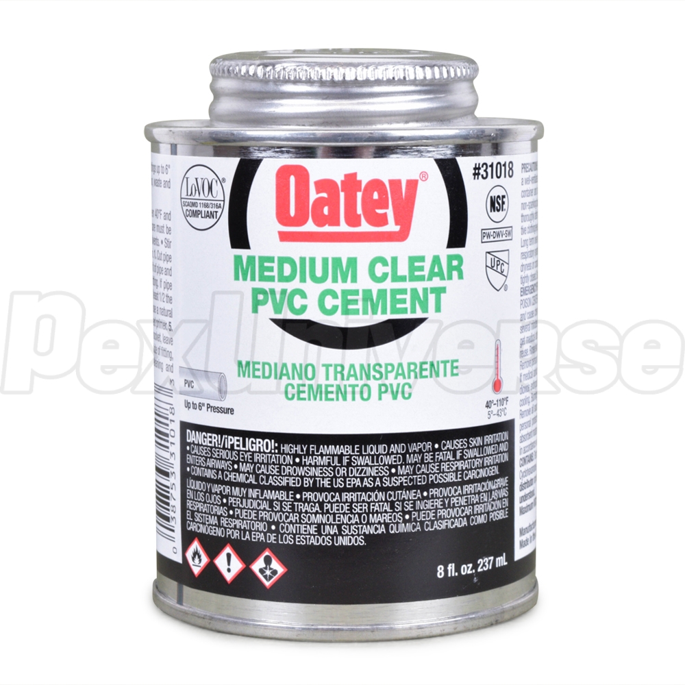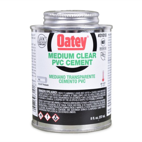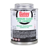 8 oz. can with dauber of medium-body clear Oatey PVC cement for DWV pipe, pressure pipe, potable water, and electrical (conduit) applications.