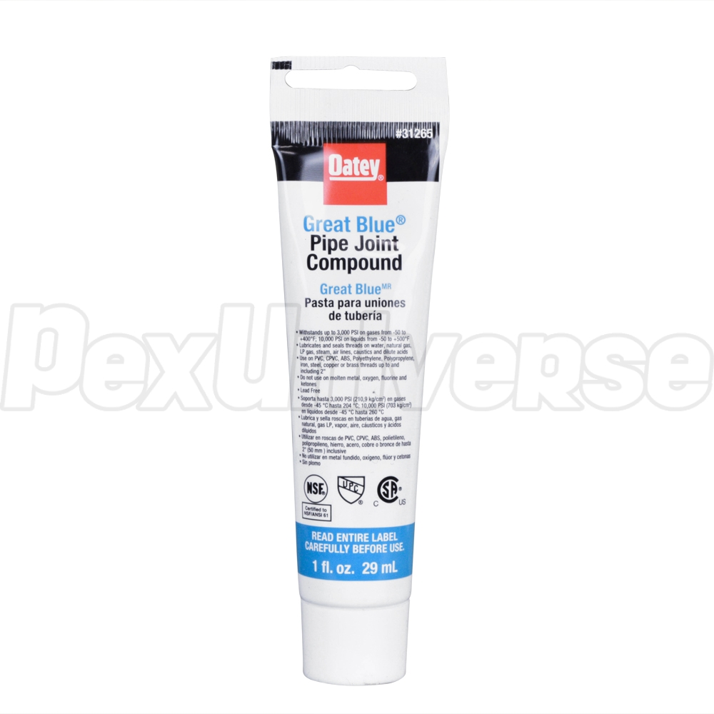 1 oz. tube of Oatey Great Blue pipe joint compound seals threaded connections on metal and plastic pipe up to and including 2" diameter.