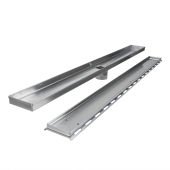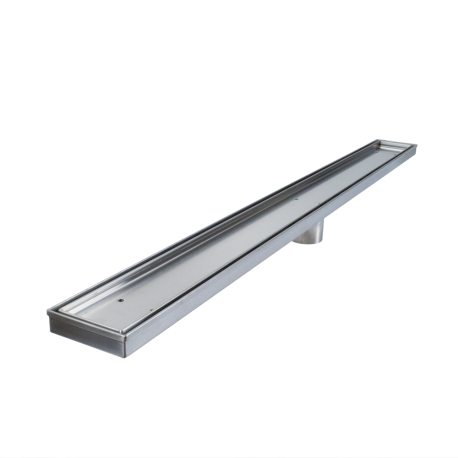 36" long linear drain with shower flashing adapter in corrosion-resistant stainless steel. Removable top strainer is designed for use with tile pieces to compliment shower/bathroom design.