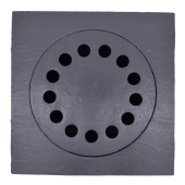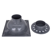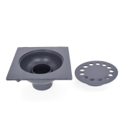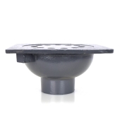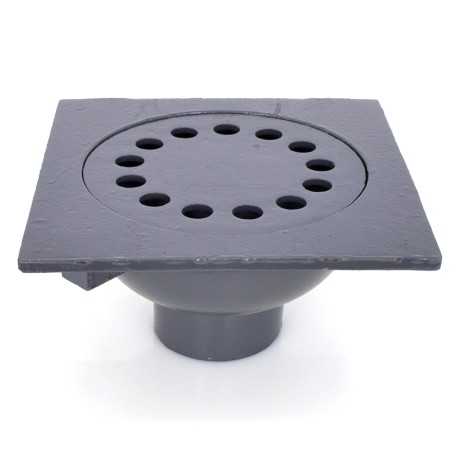 Bell trap drain is a low-profile drain with P-trap integrated into the sump area. Ideal for installations with height (depth) restrictions. Heavy-duty cast iron body and strainer, suitable for commercial and industrial needs. Square shape simplifies tile installation.