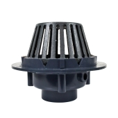 Standard flat roof drain with key-and-keyhole type, UV-resistant gravel guard and enamel coated heavy-duty dome strainer. Gravel guard secures to the drain body with (4) screws into solid brass inserts.