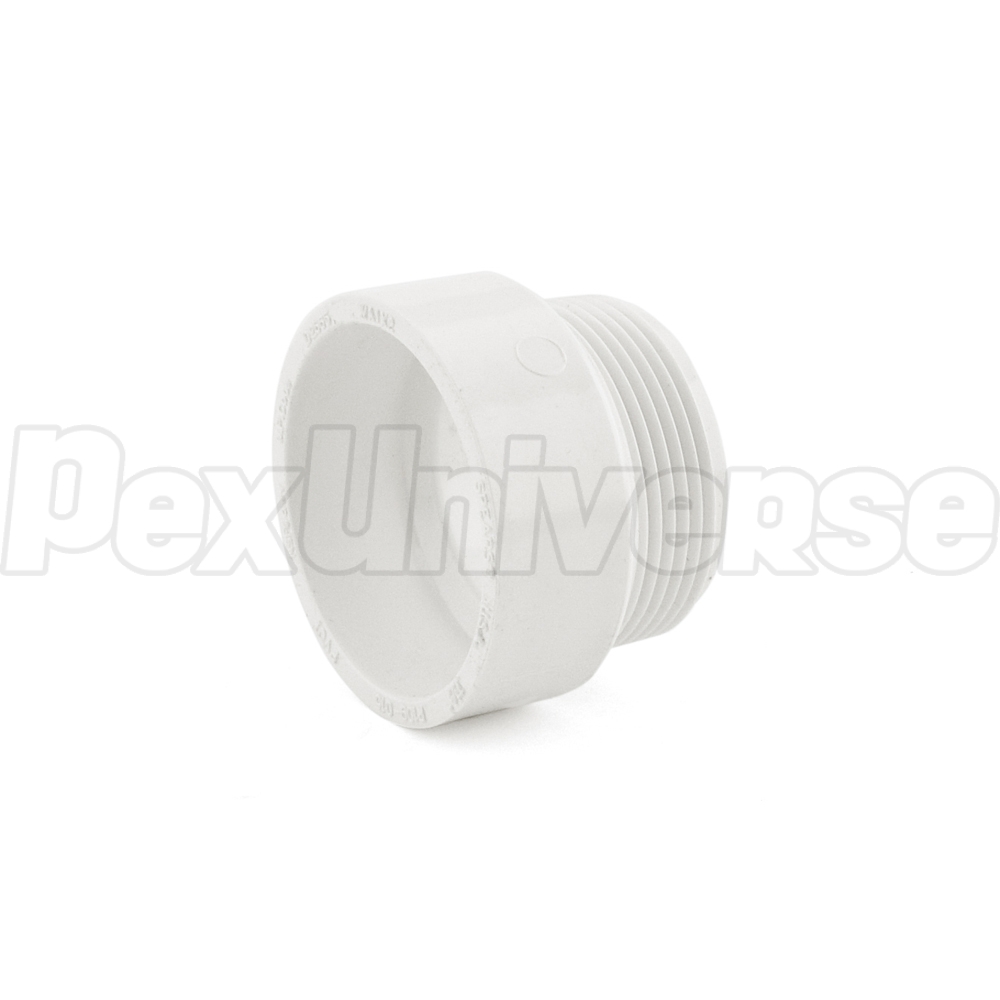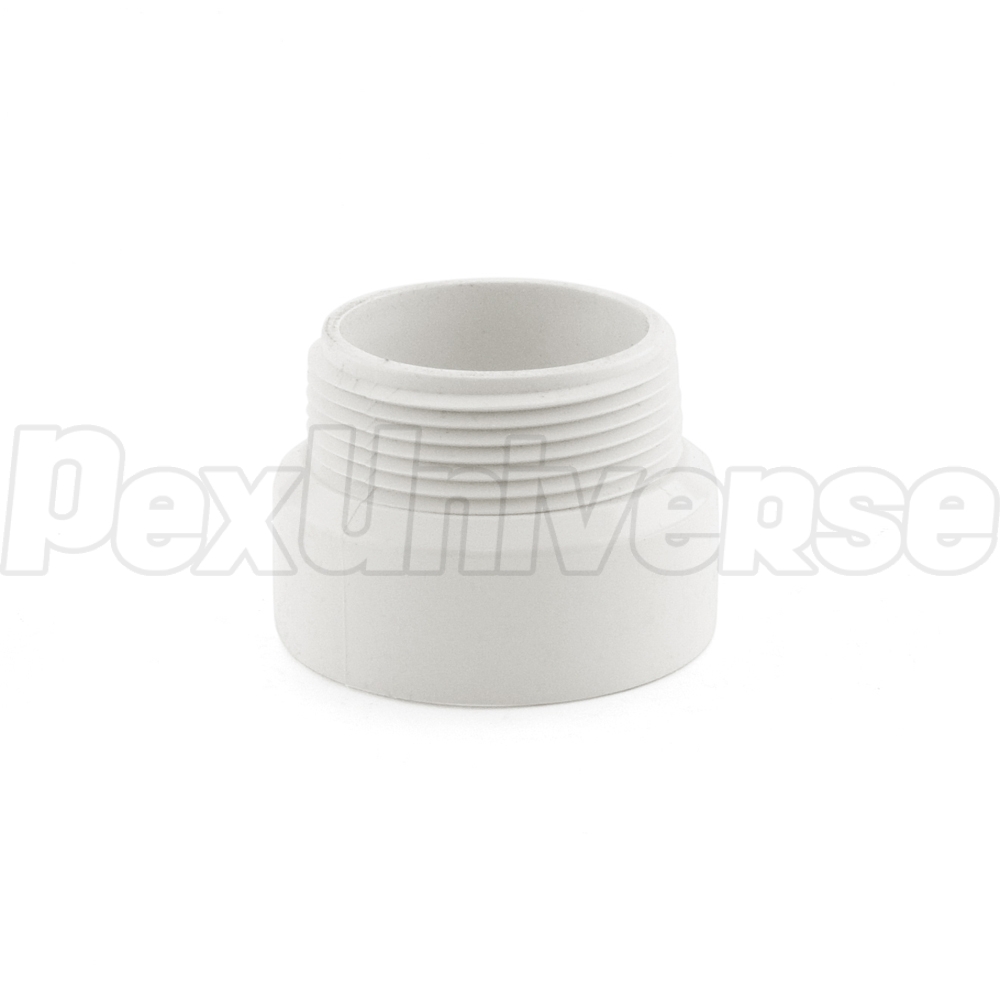 This adapter fitting connects 1-1/2" PVC pipe to a 1-1/2" female threaded outlet (standard NPT thread) in a straight line.