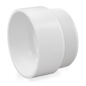 This adapter fitting connects 4" PVC pipe to a 4" female threaded outlet (standard NPT thread) in a straight line.