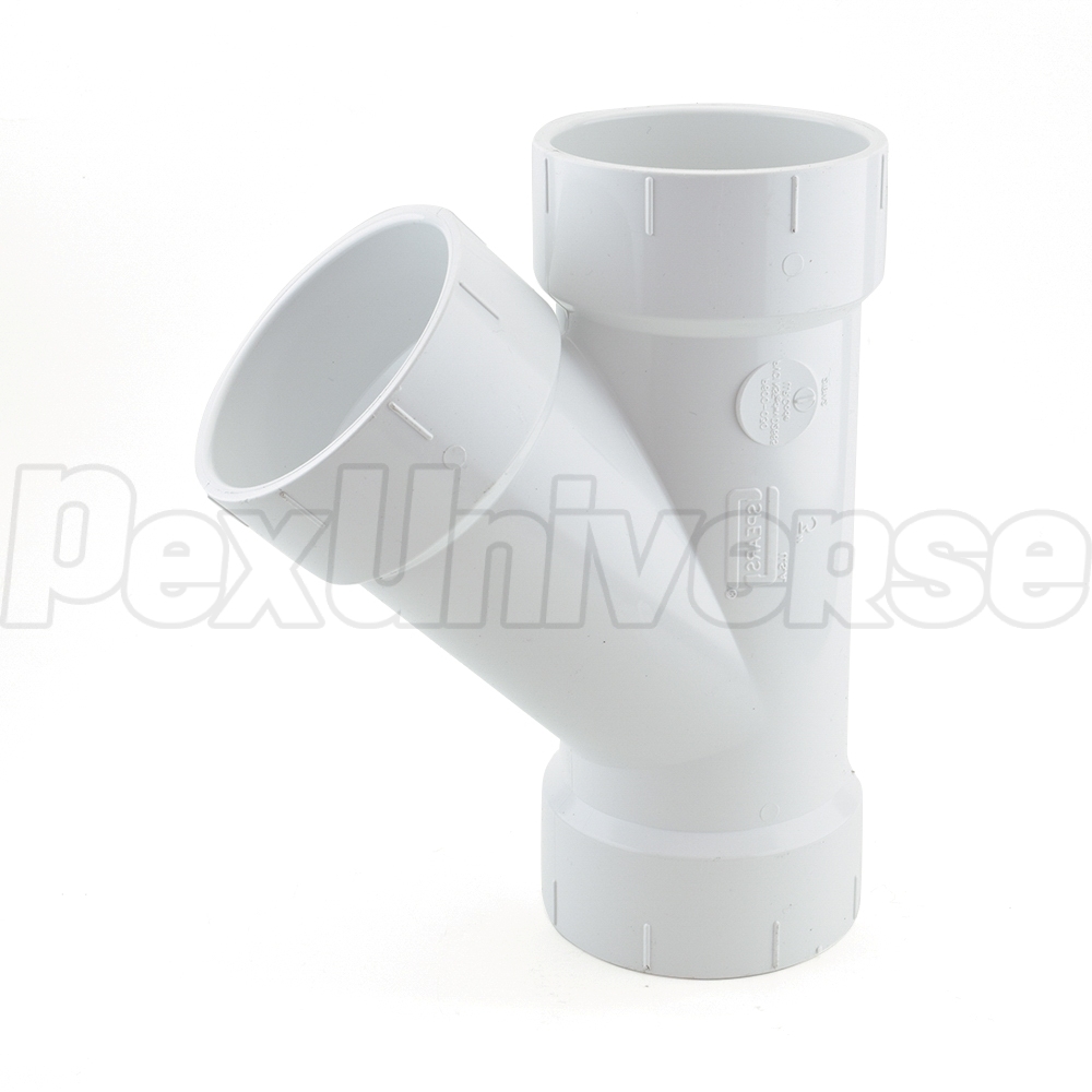 This wye fitting connects a 3" PVC branch line into a 3" PVC main horizontal drain line. Socket (hub) connections on all outlets.