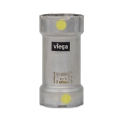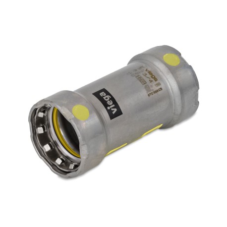Viega MegaPressG series, gas press slip coupling connects (2) 3/4" black steel gas pipes together in a straight line. This fittings does not have an internal stop and can be slid fully over the pipe.